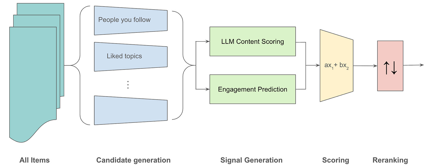 These candidates will be merged and sent to a number of “signal generators,” each of which scores each post on one or more attributes. Our initial plan is to build two signal generators: an LLM scorer and an engagement predictor.